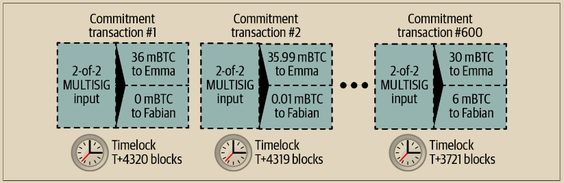 图 14-3 展示了 Emma 和 Fabian 之间的通道以及更新通道余额的承诺交易。
