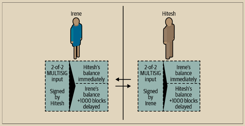 现在,与其创建一笔由两方签署的单一承诺交易,Hitesh 和 Irene 创建了两个不同的非对称承诺交易。