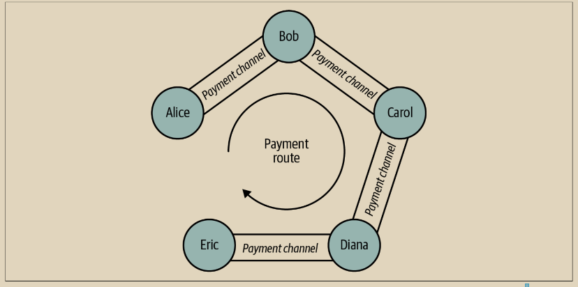 图14-6显示了闪电网络中的五个参与者,通过双向支付通道相连,可以将支付从Alice发送到Eric(请参见第332页的“路由支付通道(闪电网络)”)。