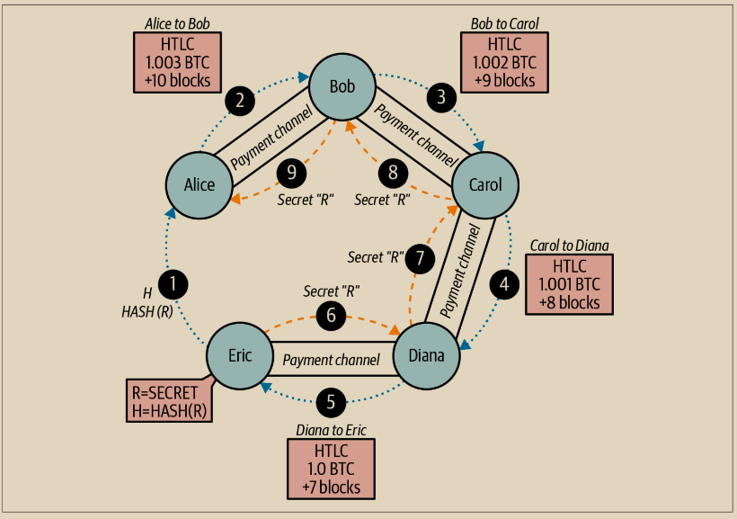 在这一步的路由中,Eric知道秘密R。因此,他可以要求Diana提供的HTLC。他将R发送给Diana并领取了1比特币,将其添加到他的通道余额中。