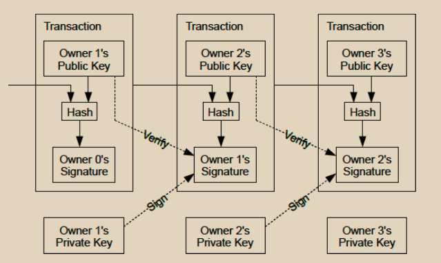 我们将电子硬币定义为一系列数字签名。每个所有者通过对上一笔交易的哈希和下一位所有者的公钥进行数字签名,并将它们添加到硬币的末尾来将硬币转移给下一个所有者。收款人可以验证这些签名以验证所有权链。
