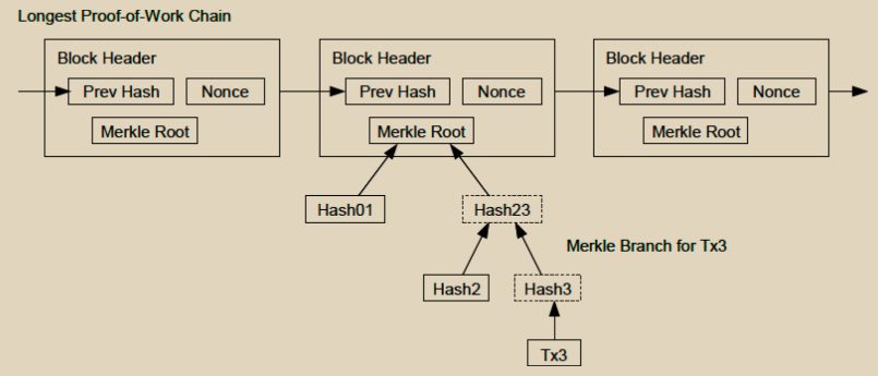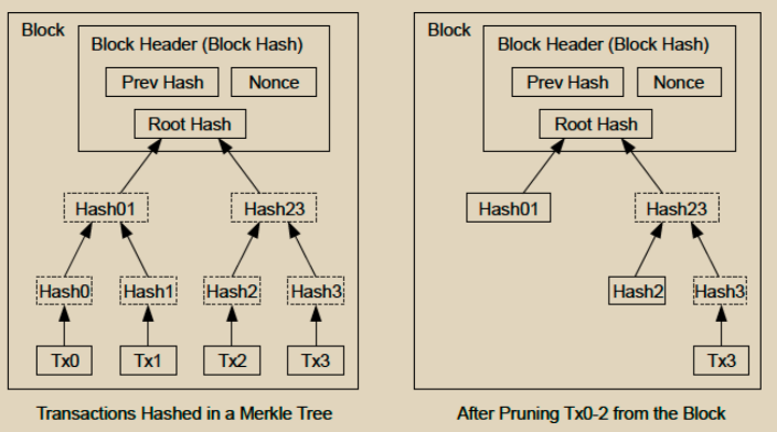 一旦一个币的最新交易被足够多的区块深埋之后,该币之前的已花费交易就可以被丢弃以节省磁盘空间。为了实现这一点而不破坏区块的哈希,交易被哈希成一个默克尔树,在区块的哈希中只包含根。旧的区块可以通过截断树的分支来压缩。内部哈希值不需要被存储。