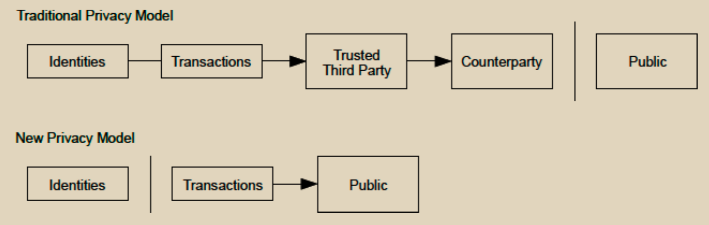 传统银行模式通过限制信息访问权限仅限于参与方和受信任的第三方来实现一定程度的隐私。必须公开宣布所有交易的必要性排除了这种方法,但隐私仍然可以通过在另一个地方中断信息流来维护:通过保持公钥匿名。公众可以看到某人向另一个人发送了一笔金额,但没有信息将交易与任何人联系起来。这类似于股票交易所公布的信息水平,即单笔交易的时间和金额(“电子交易信息”)是公开的,但没有透露交易双方是谁。