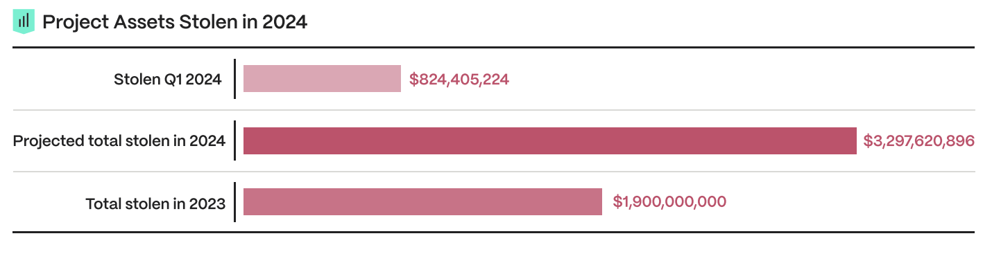 • $824,405,224 被盗:在 2024 年第一季度,加密货币领域发生了 67 起黑客攻击事件,总计被盗 $824,405,224。恶意活动的激增凸显了加强安全措施的迫切需要。