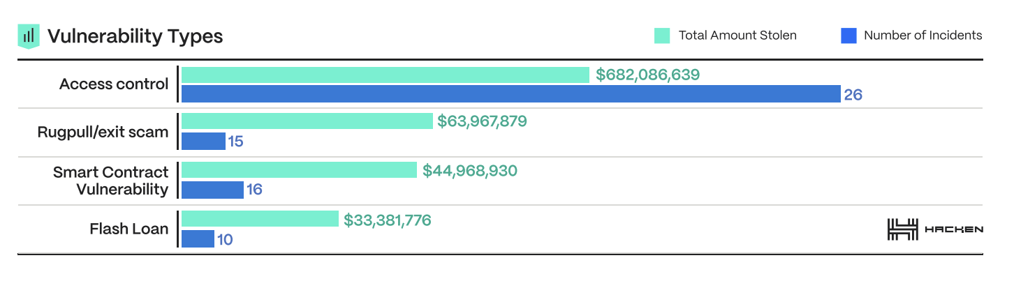 • $682,086,639:访问控制漏洞成为最普遍的漏洞,因这种漏洞损失了 $682,086,639。这些事件突出了强大的访问控制机制的关键重要性。