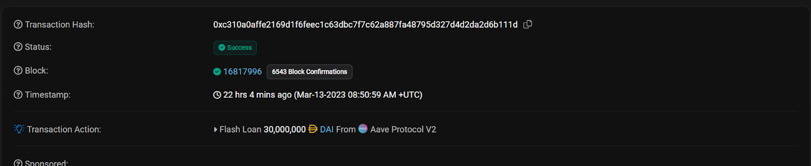 黑客创建了三个合约:一个主要的合约,然后是另外两个用于违规和清算的合约。他们从闪电贷协议 Aave 获得了一笔 3000 万 DAI 的闪电贷,并将其发送到违规合约。