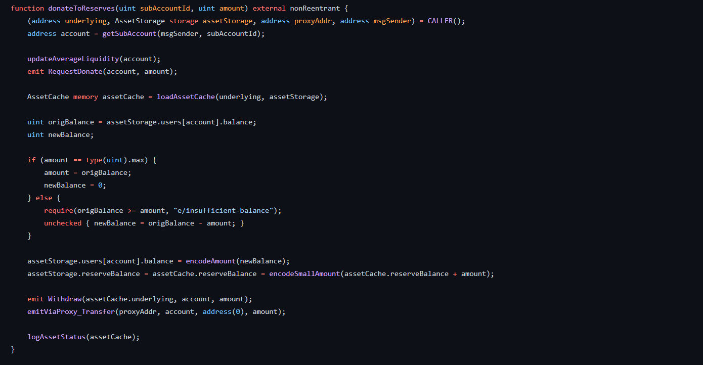 1. donateToReserves 函数缺乏流动性检查。 donateToReserve 函数允许 Euler 的用户将资金存入保留地址。每个调用此函数的人都拥有债务代币 (DToken) 和权益代币 (EToken)。