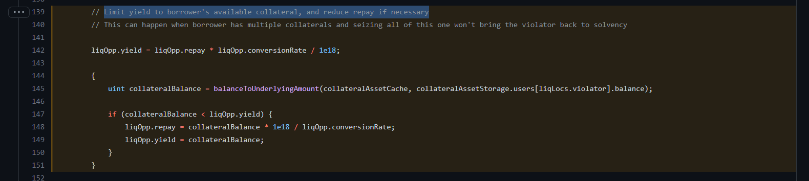 此代码块背后的逻辑是,没收借款人的所有抵押品并不一定意味着他们仍然有偿付能力。因此,他们剩下的任何抵押品都应该足够。但是,攻击者可以通过进行抵押不足的杠杆来利用此逻辑。