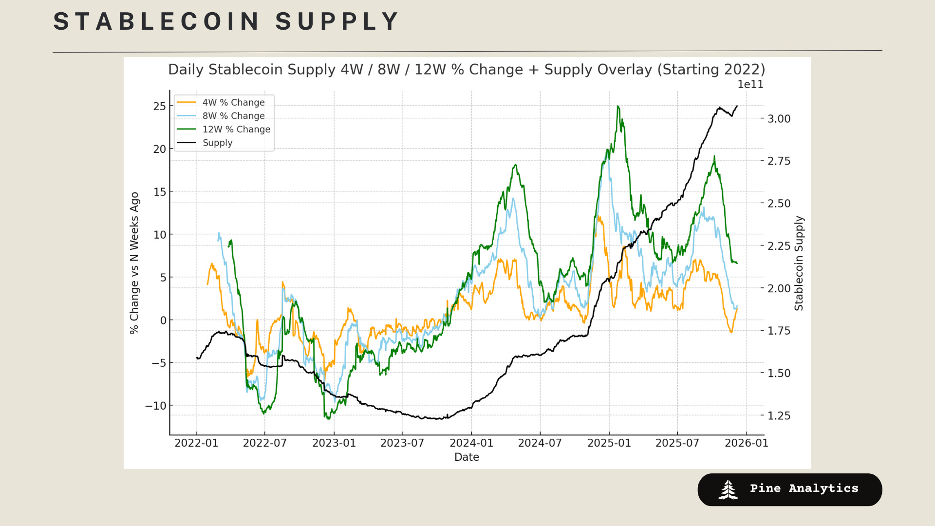 加密货币市场反映的是早期的积累,而不是狂热。BTC 和 ETH 的主导地位依然稳固,ETF 的资金流动平缓但稳定,市场情绪仍然处于“恐惧”之中,但正在改善,搜索兴趣接近年度低点。在经历了一个月的停滞后,稳定币供应开始重新加速,资金广泛流入主要发行方,并且在 Solana、Tron 和 Aptos 上表现强劲。