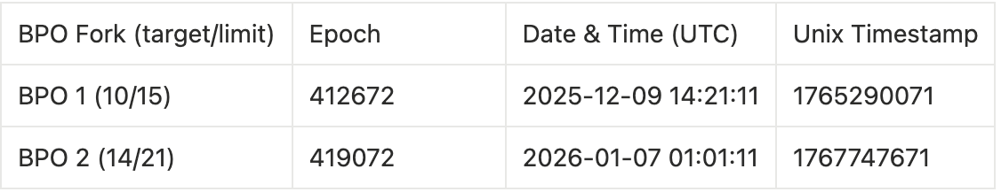 在 Fusaka 主激活之后,网络将实施 BPO 分叉以逐步增加 Blob 吞吐量。BPO1 将把每个区块的 Blob 目标值提高到 10,最大值提高到 15。