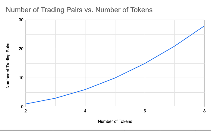 在上一节中,我们讨论了多代币池如何比传统的双代币池产生更多的交易对。 如果你的池中有 8 个代币,则需要 28 个双代币池才能提供等效数量的直接交易对!