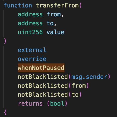 一旦通过监控检测到,对事件的有效响应需要在智能合约级别具有功能。今天最常见的功能是暂停协议,例如下图所示的 USDC 使用的暂停。