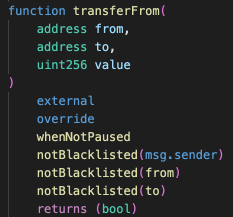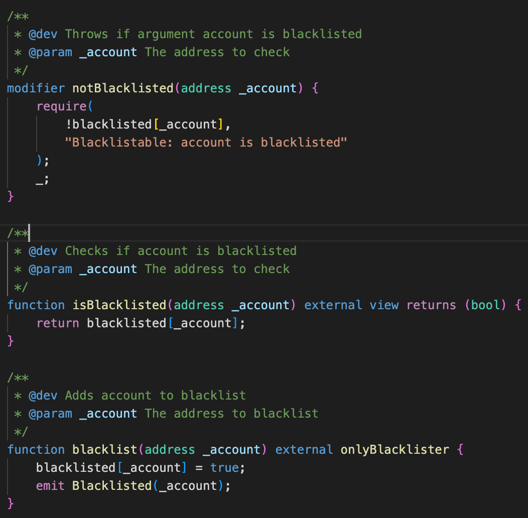 允许列表最常见的是项目为一部分用户提供对协议的早期访问权限的机制,但它也可以成为将功能访问限制为一组受信任地址的有用工具。阻止列表与允许列表相反,它假设所有地址都是允许的,除非另有说明。像 USDC 这样的稳定币(代码如下所示)实施阻止列表以维持对 OFAC 制裁地址的合规性。