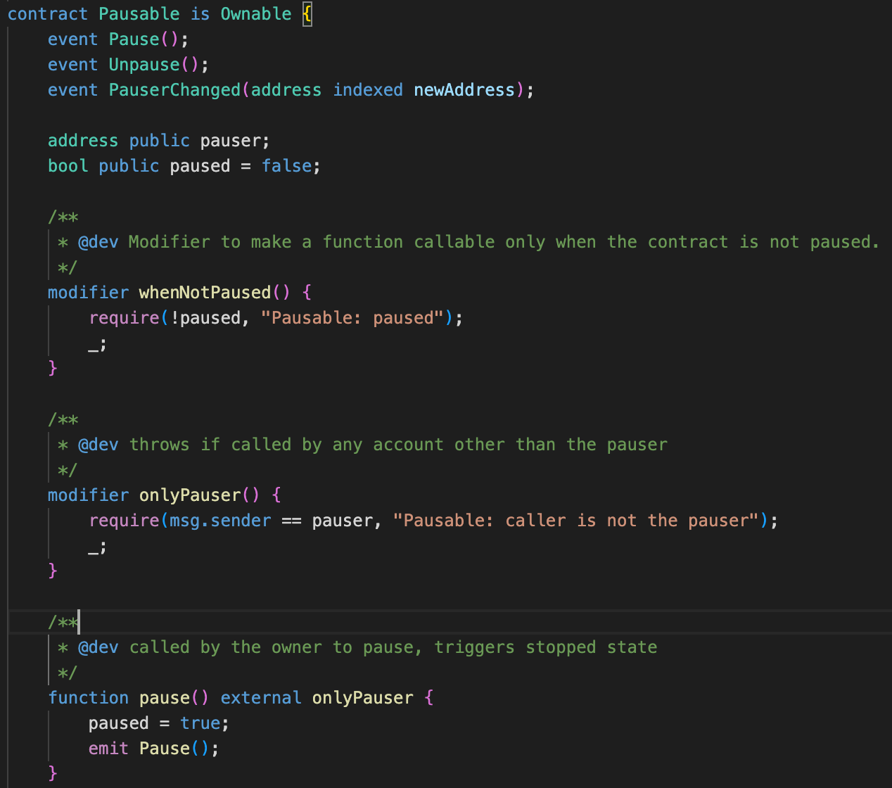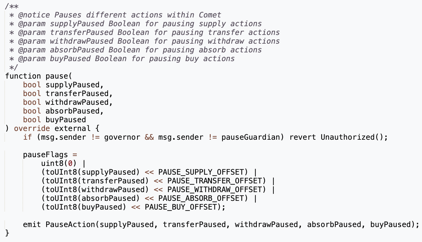 暂停已成为默认的响应机制,并以两种方式实施。首先,在广泛的层面上暂停整个协议。其次,在细粒度的层面上暂停各个功能,Compound 中的一个示例在下面显示。