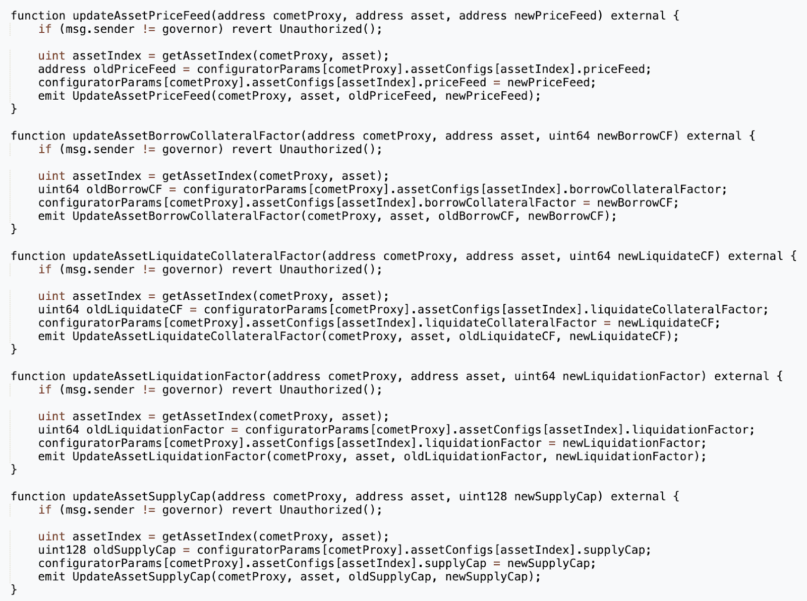 以 Compound 为例,它们还可以修改供应上限、借入抵押品、清算因子和资产价格提要,以减轻安全事件造成的损害。下面显示了一些允许这些修改的功能示例。