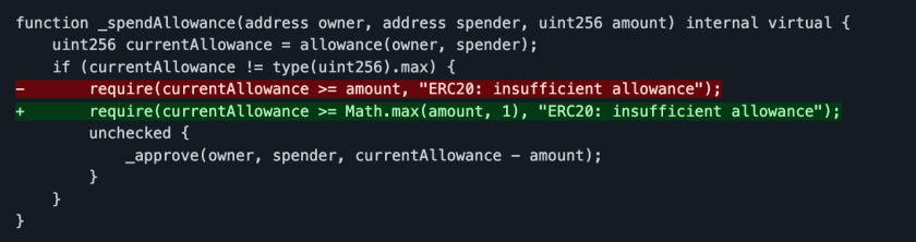 这种方法将迅速解决地址污染攻击的问题,这些攻击最近变得越来越普遍。但是,此实现偏离了“0 值的转移必须被视为正常转移并触发转移事件”的声明。如果进行此更改,则 0 的 currentAllowance 将不满足此检查。