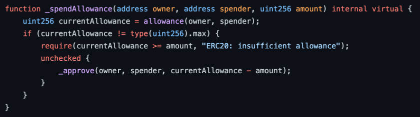 原因在于 _spendAllowance 函数如何评估调用者和资金发送者之间的批准。有一个 require 语句评估 currentAllowance 与发送者请求的金额,如果津贴不足以进行转移,它将返回“ERC20: insufficient allowance”。