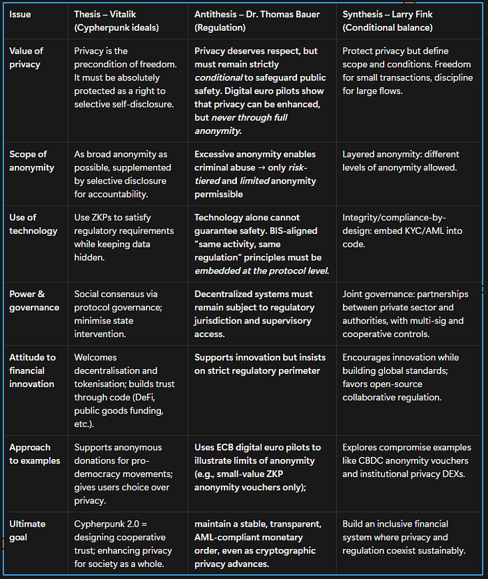 Vitalik 的理想主义、Bauer 博士的监管现实主义和 Larry Fink 的市场导向的实用主义共同说明,只有当这三种观点建设性地互动时,才能产生可持续的解决方案。 Bauer 的干预借鉴了欧洲央行关于数字欧元的工作以及欧洲严格的 AML/CFT 框架,提醒我们,隐私不能脱离监督义务、货币主权和机构信任而存在。