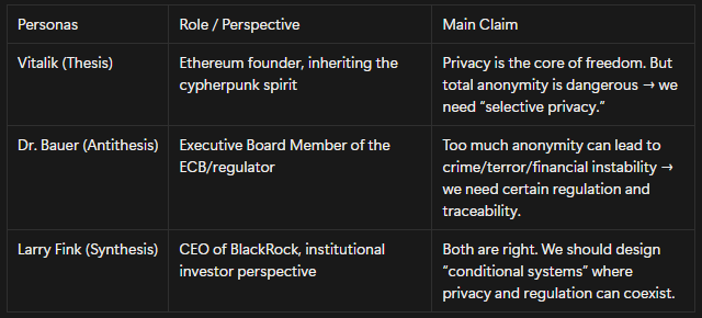 这三个人分别代表不同的观点:密码朋克 vs. 监管 vs. 有条件的平衡。我们确认每个人都在模拟自己对各种问题的立场。关于隐私的价值,Vitalik 认为隐私是自由的基础,Thomas Bauer 博士认为隐私很重要,但坚定地服从于公共安全和货币稳定,而 Larry Fink 认为隐私需要受到保护,但要有明确的范围和条件。关于匿名的范围,Vitalik 提倡通过选择性披露来保证匿名性,Thomas Bauer 博士仅支持符合欧洲央行使用基于 ZKP 的匿名凭证进行的实验的风险分级和有限的匿名性,而 Larry Fink 提出了基于风险级别的分层匿名性。关于技术的使用,Vitalik 支持使用零知识证明等技术来在满足监管要求的同时保持信息的私密性,Thomas Bauer 博士认为技术必须与可执行的监督和嵌入在协议层的 BIS 对齐的“相同活动,相同监管”约束相结合,而 Larry Fink 则提倡将监管直接嵌入到代码中的技术。