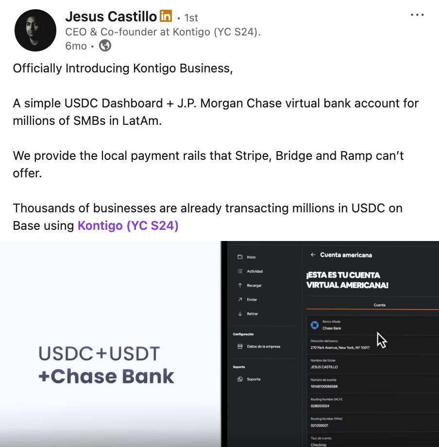 不仅仅是消费者。Kontigo 扩展到以委内瑞拉企业为目标,但 Castillo 的 LinkedIn 帖子 更谨慎地将该产品描述为面向“拉丁美洲的中小企业”。