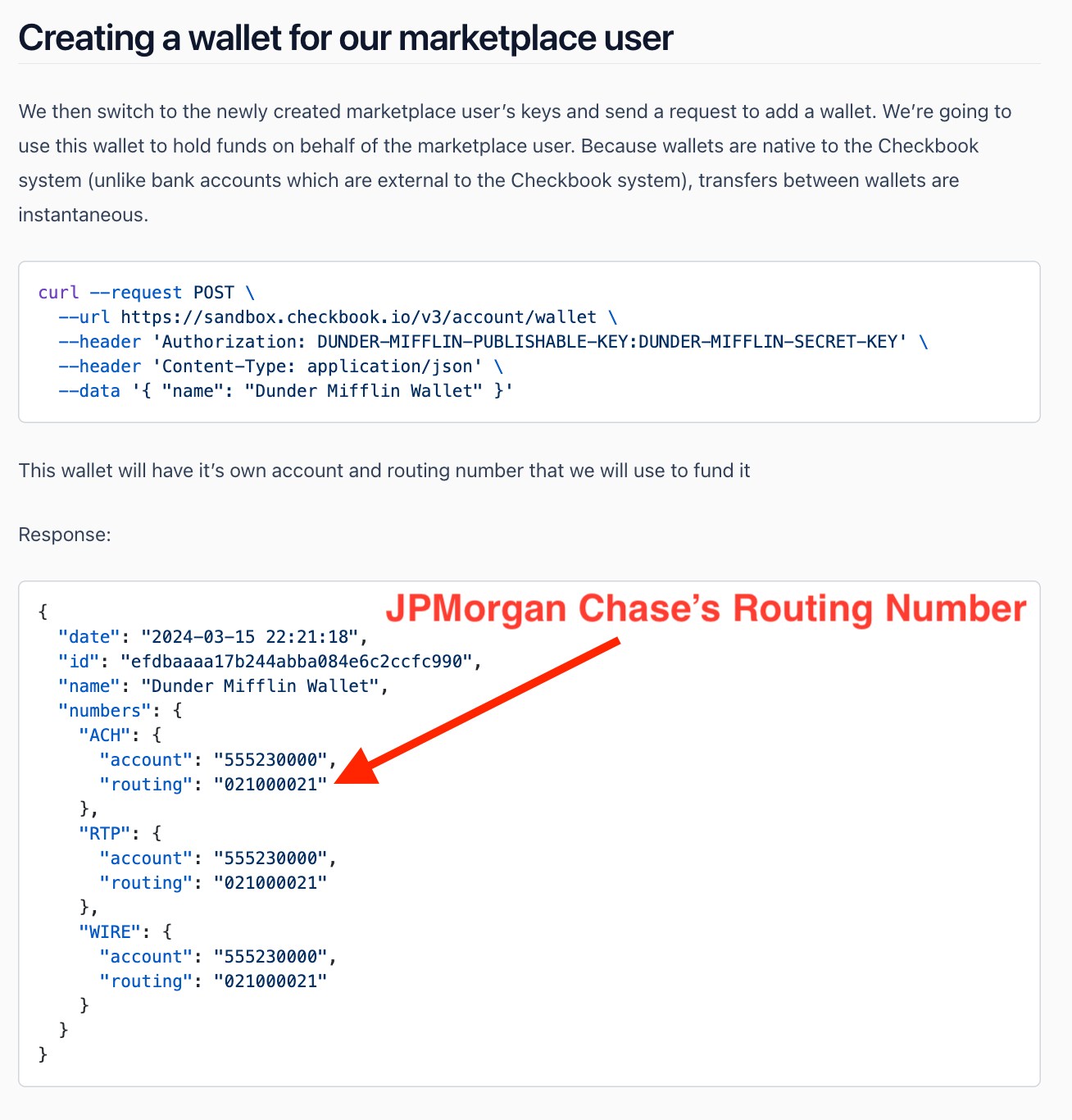 关于为“市场用户”创建钱包流程的更多文档 展示了Checkbook如何代表Kontigo的终端用户创建摩根大通(JPMorgan Chase)虚拟账户凭证——这些终端用户中的大多数似乎是委内瑞拉的消费者和企业,这是一个高风险司法管辖区,几乎所有美国银行都避而远之。