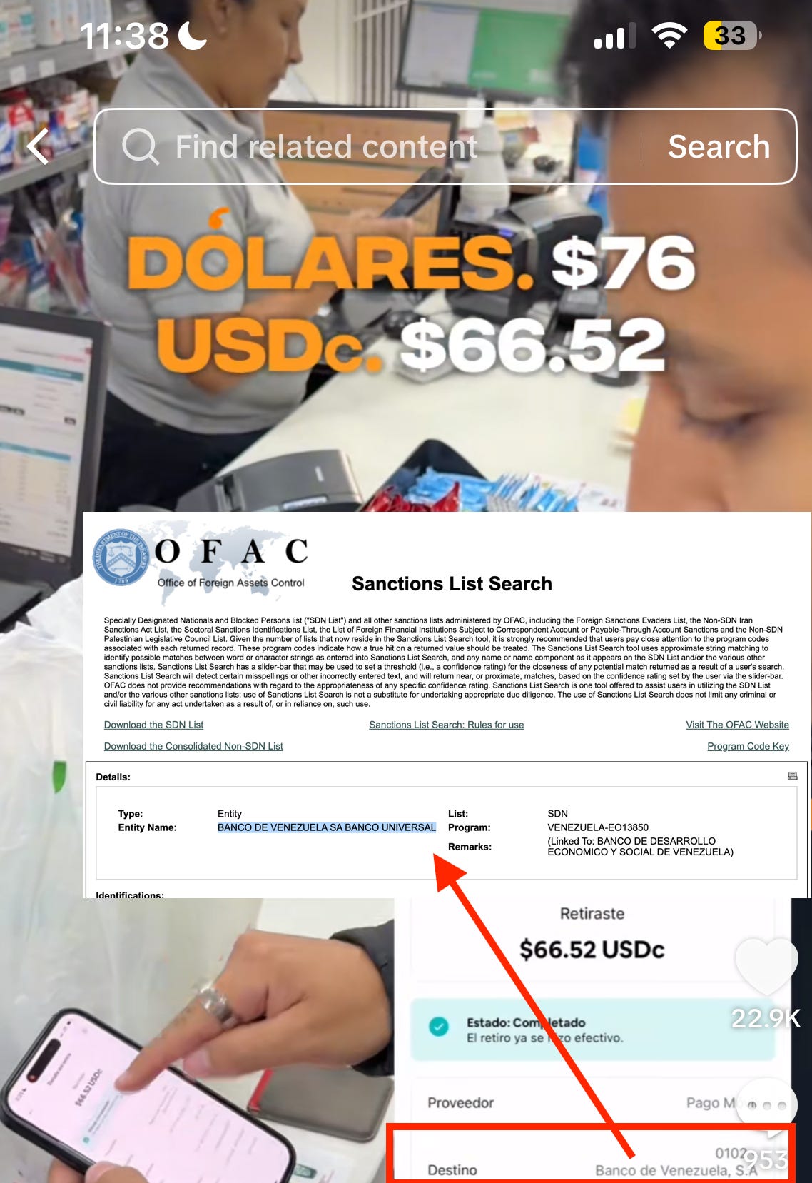 在视频中,Castillo 演示了将在 Kontigo 中以 USDC 形式持有的资金转移到委内瑞拉银行 Banco de Venezuela——该银行在特朗普总统的第 13850 号行政命令下受到明确制裁: