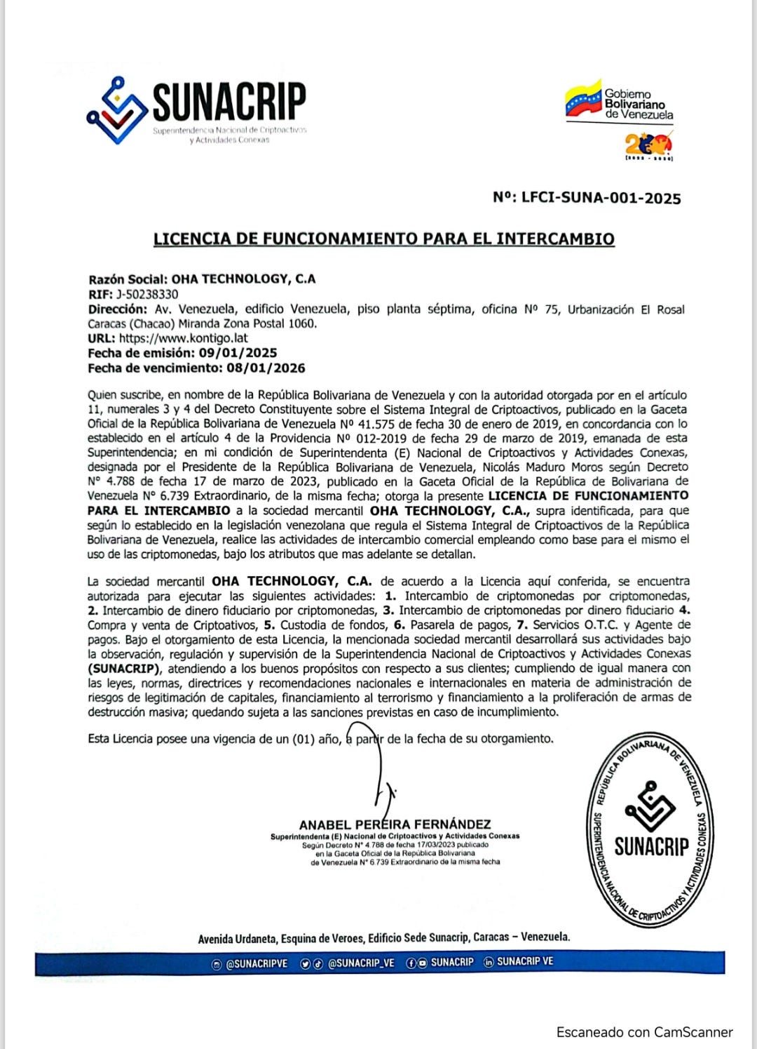 Oha Technology, C.A. 也于 2025 年 1 月 9 日获得了 SUNACRIP 颁发的许可证。