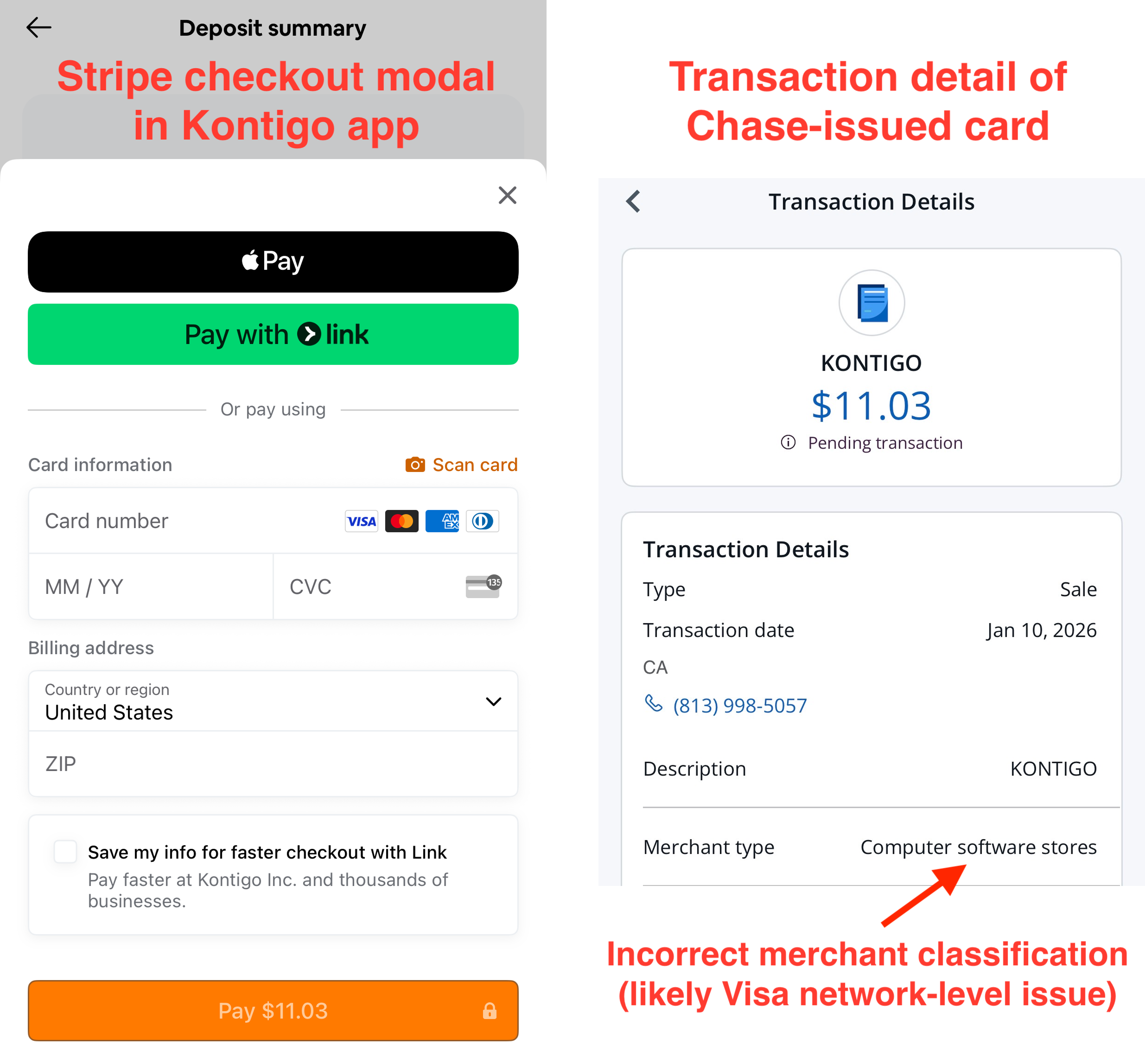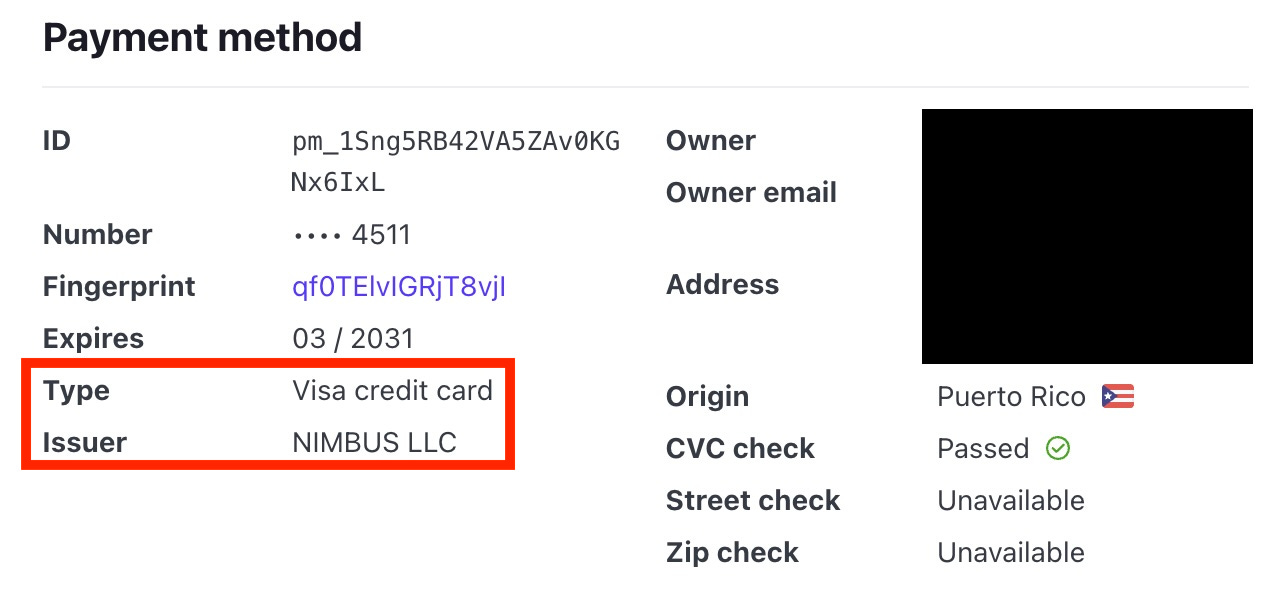 Kontigo Visa 卡上的测试交易的商家记录证实发行方是 Nimbus LLC,也就是 Rain。