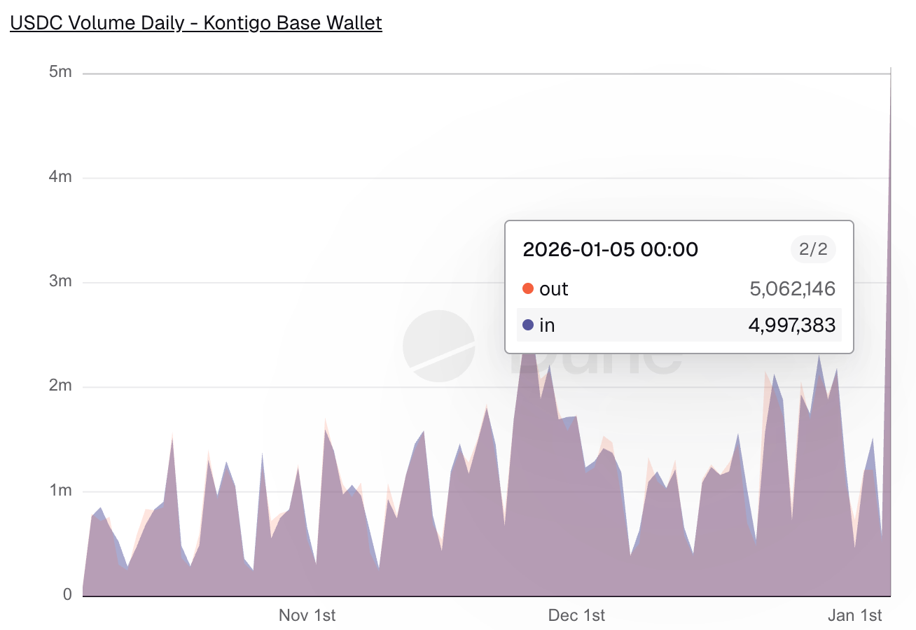 该 Kontigo 钱包目前仅持有 Base 上的 36 万美元 USDC 和以太坊上的 15.4 万美元 USDT(Tether)。