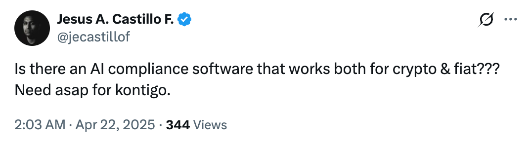 在开始提供摩根大通虚拟账户凭证不到一个月前,Kontigo 首席执行官发推文,询问是否有人知道“适用于加密货币和法定货币的 AI 合规软件”。此时,该公司似乎已经以某种身份运营了大约 16 个月或更长时间。