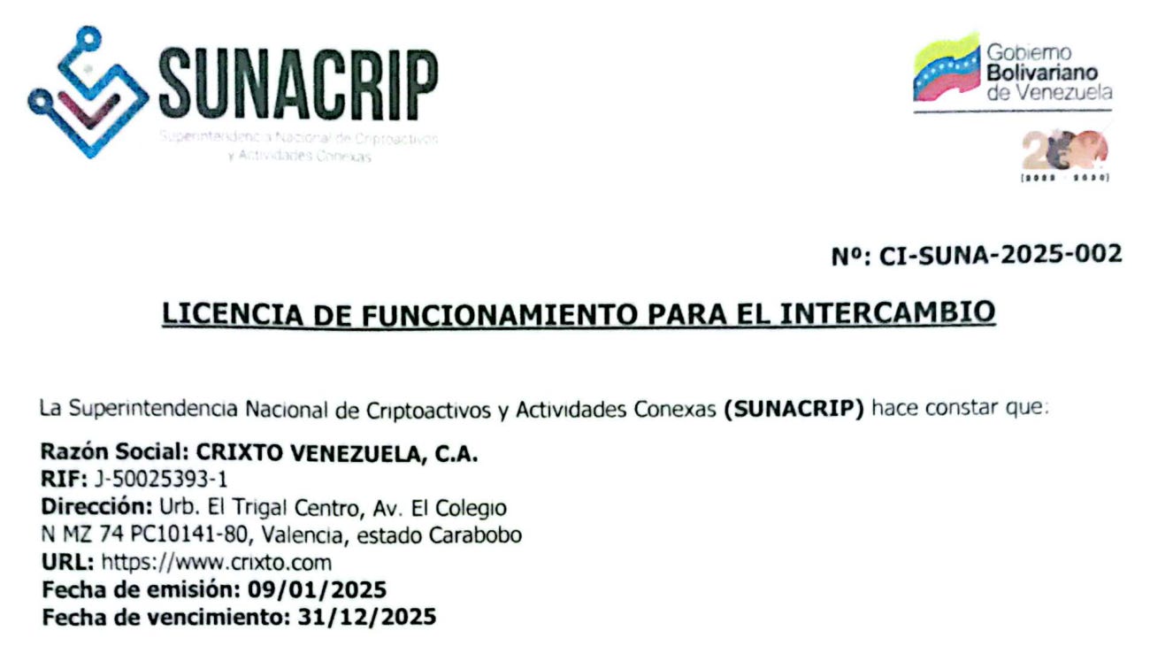 Crixto 并没有努力掩盖它在做什么。它 获得了由委内瑞拉加密货币监管机构 SUNACRIP 颁发的许可证,日期为 2025 年 1 月 9 日,由 Anabel Pereira Fernández 签署,她是负责重组 SUNACRIP 的委员会主席。