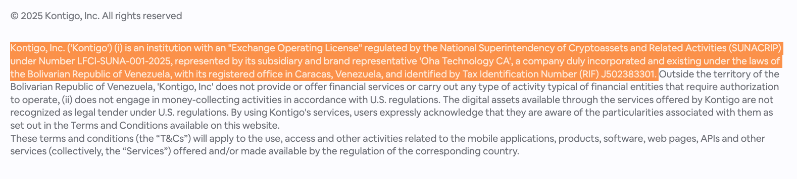 Kontigo 网站的 存档版本 明确地将两者联系起来,披露声明称 Kontigo, Inc.——一家特拉华州公司,据推测,Y Combinator、Coinbase Ventures、DST Global、Soma Capital、HF0、Alumni Ventures、Bayhouse Capital 和其他公司持有其股权 ——由其子公司和品牌代表 Oha Technology, C.A. 代表。