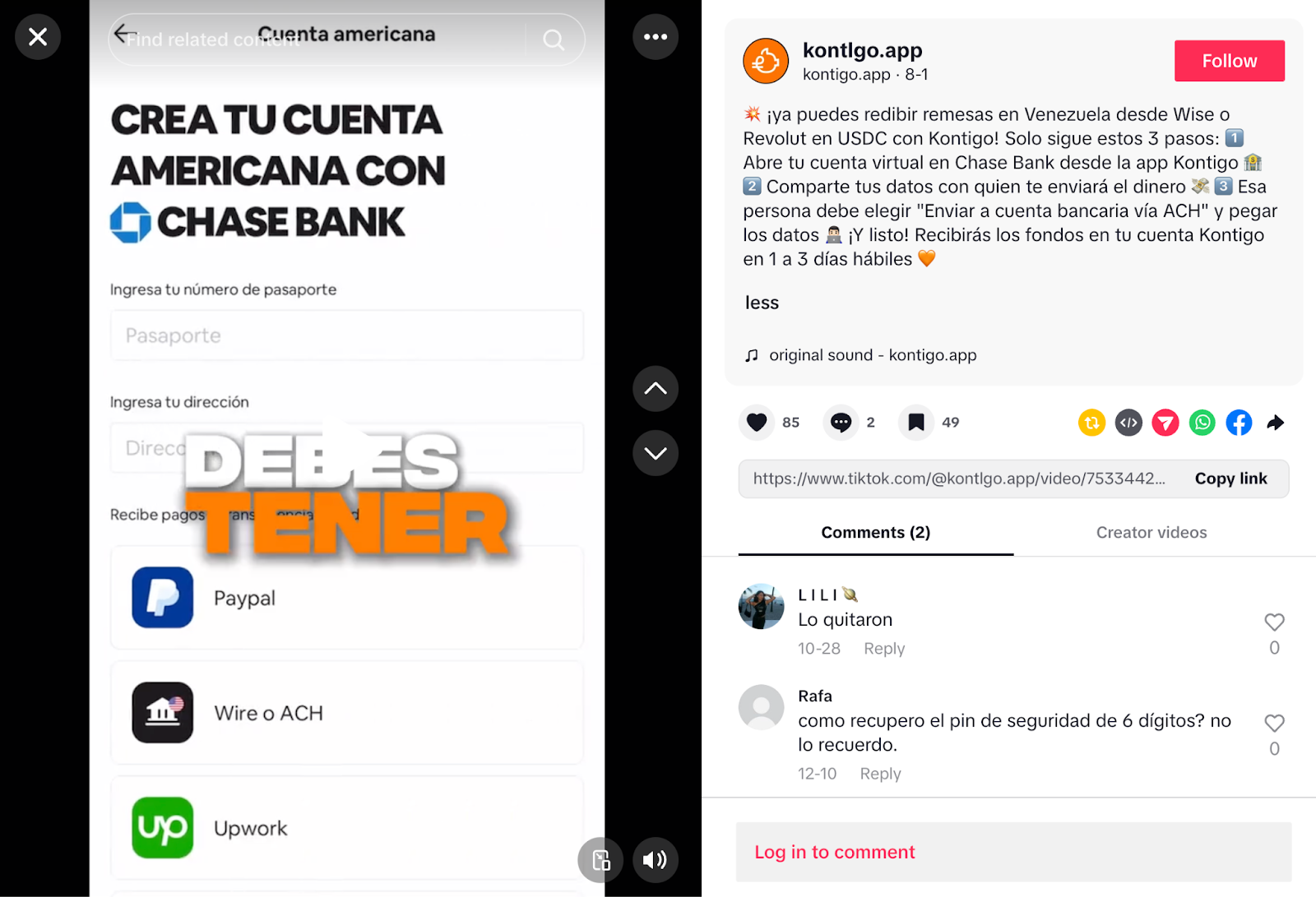 Castillo 在 这段 2025 年 1 月的 Tiktok 视频 中演示了委内瑞拉用户如何在 Kontigo 中以 USDC 形式持有余额,并相对容易地转换为玻利瓦尔以用于本地消费。
