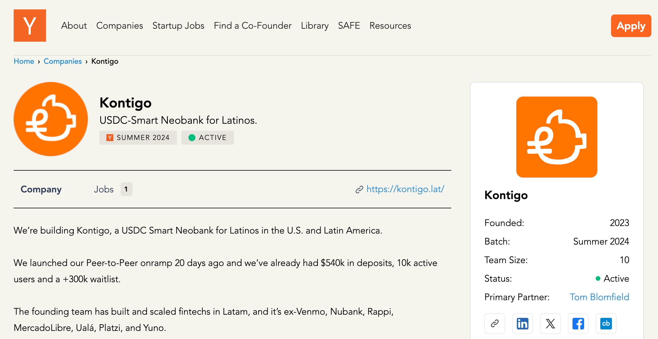 但是,当 Kontigo 申请并被接受进入著名的硅谷加速器项目 Y Combinator 时,它将自己描述为“面向拉丁美洲人的 USDC 智能新银行”。Y Combinator 由 Paul Graham 共同创立,从 2014 年到 2019 年由现任 OpenAI 首席执行官 Sam Altman 领导,并且自 2023 年 1 月以来一直由 Garry Tan 领导。