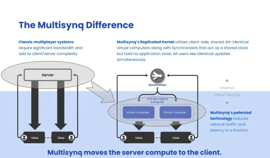Multisynq 旨在为实时同步构建一种新的互联网协议。如今,没有用于实时同步的标准化协议,因此游戏服务器和视频会议工具等应用程序必须从头开始构建自己的解决方案。在中心化客户端-服务器设置中,服务器处理所有计算,这会创建一个单点故障。