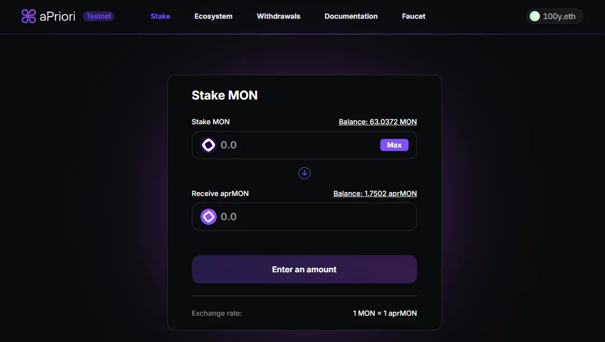 aPriori 在 2023 年从 Hashed 和 Arrington Capital 筹集了 200 万美元的种子前资金,在 2024 年 7 月从 Pantera、Consensys 和 Flow Traders 筹集了 800 万美元的种子资金,并在 2025 年 8 月从 Pantera、HashKey 和 IMC Trading 筹集了额外的 2000 万美元。这使其成为 Monad 生态系统中资金最雄厚的 dApp 之一。用户可以在测试网上质押 MON 以获得 aprMON,并在各种 DeFi 协议中使用它。