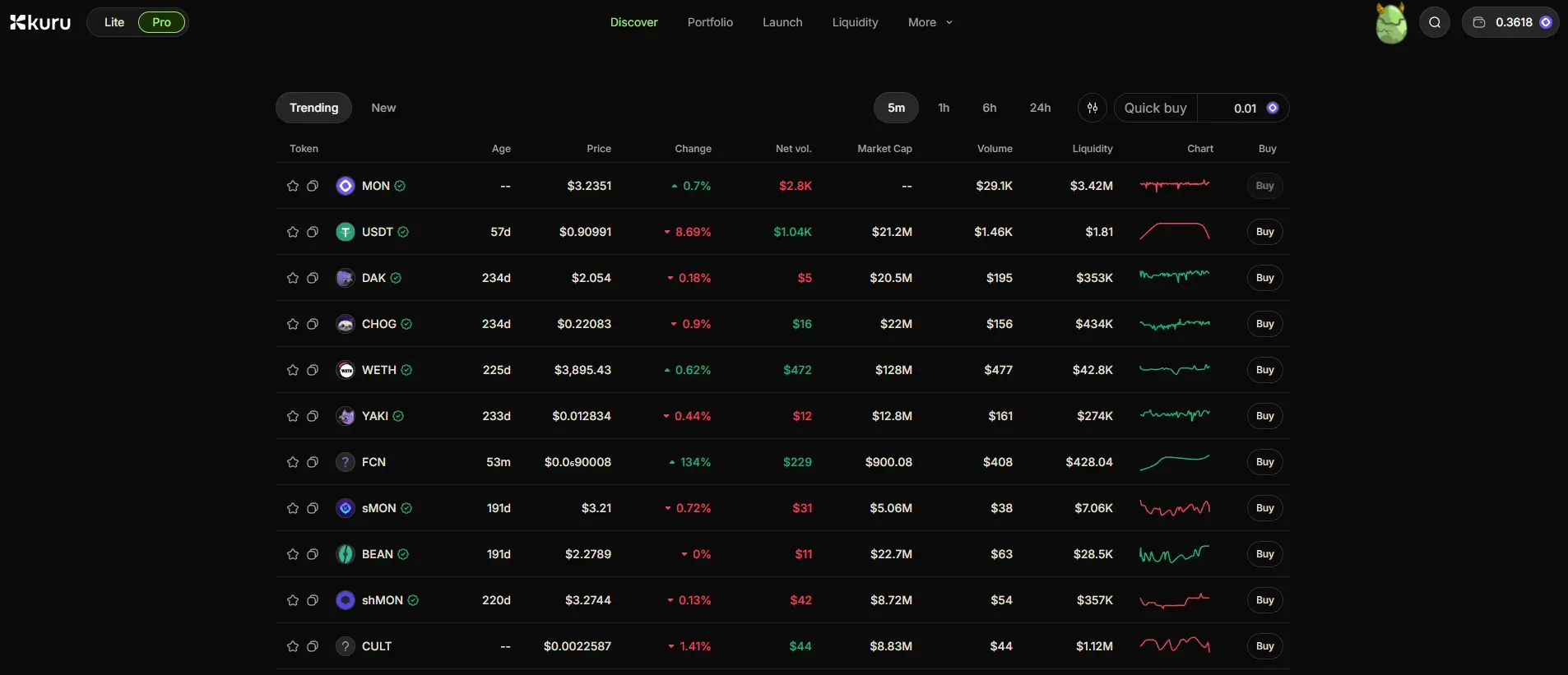 Kuru 提供两种模式,Lite 和 Pro。在 Pro 模式下,用户可以通过订单簿交易不同的代币,也可以提供流动性。在 Lite 模式下,用户可以使用使用订单簿流动性的简单交换界面轻松地交易代币。