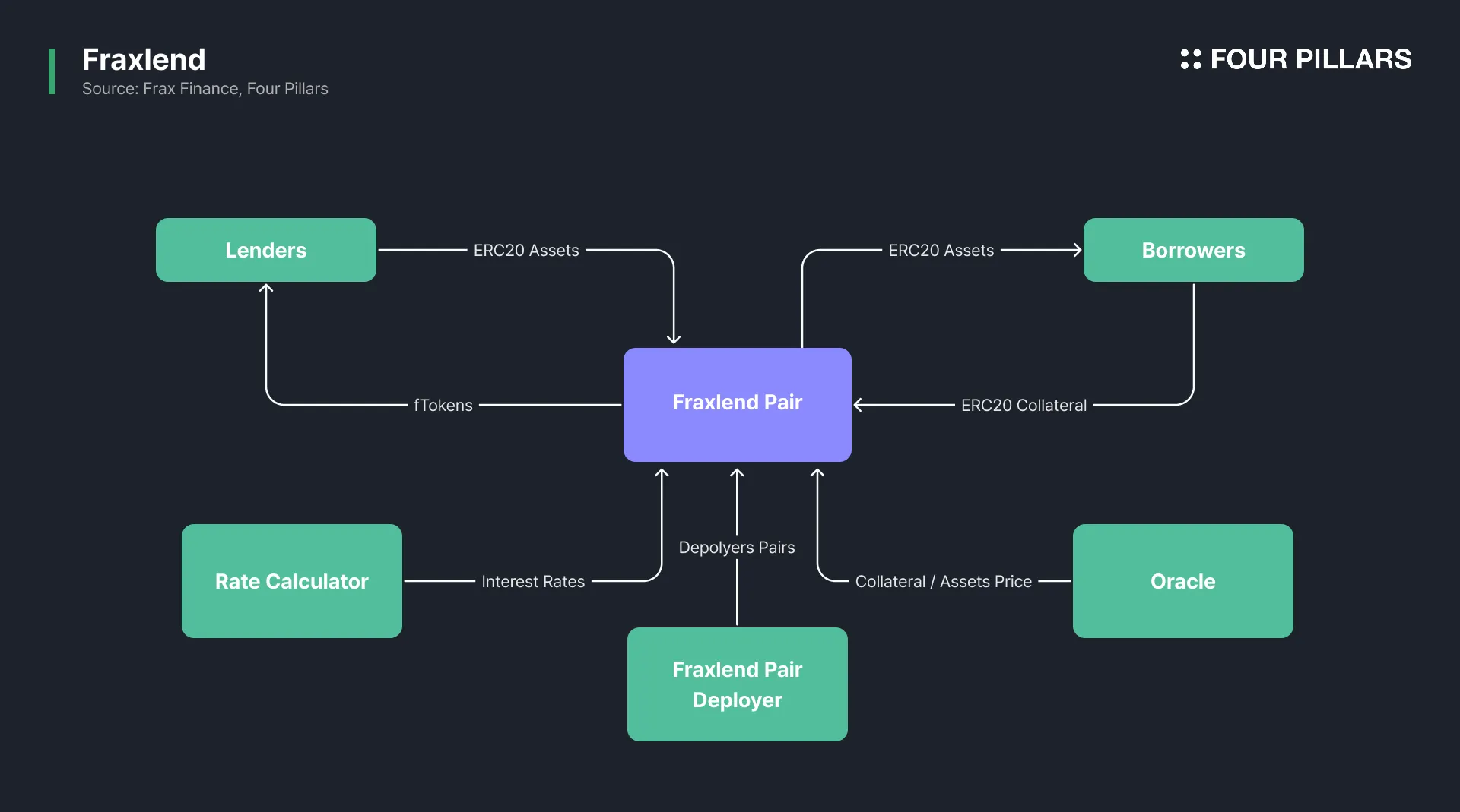 Fraxlend 提供隔离的借贷市场,每个市场由一对 ERC-20 资产组成,其风险包含在该对资产中。这种结构可防止一个市场的波动蔓延到其他市场。用户可以存入一个 ERC-20 代币作为抵押品并借入另一个代币,从而允许无需许可地参与借贷。
