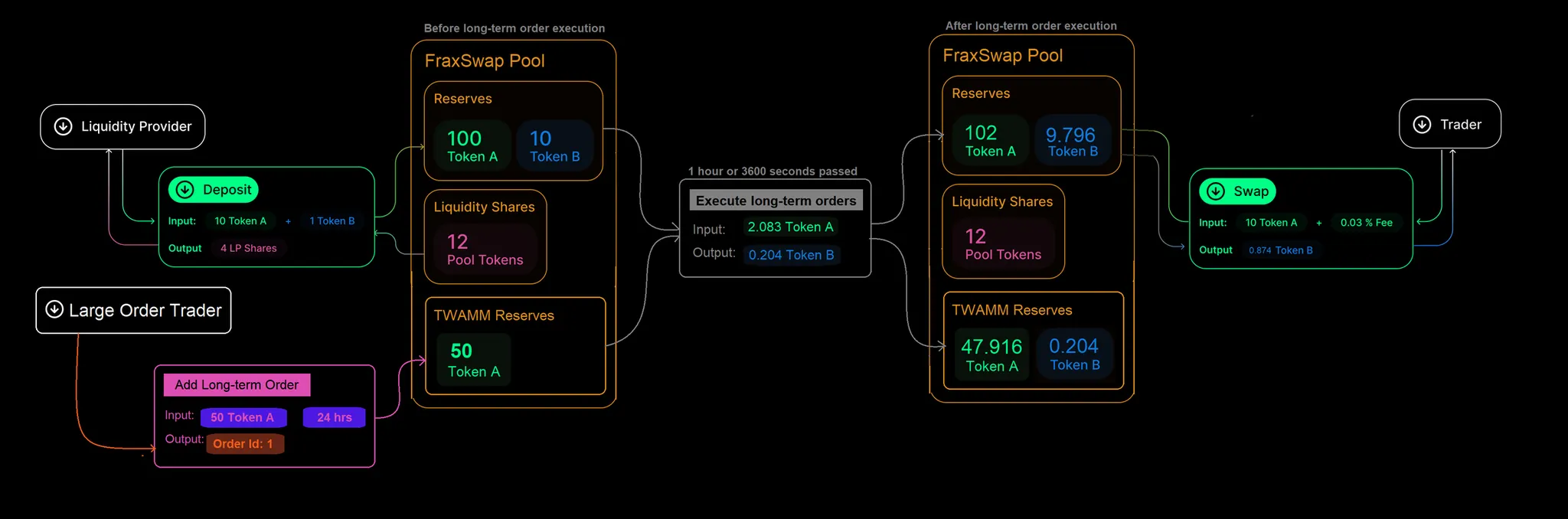TWAMM 在较长时间内以稳定的速度执行大型买入或卖出订单。例如,如果交易者提交一个长期订单,在 2,000 个区块内出售 100 个 ETH,TWAMM 会将其分解为许多小交易以逐步执行。Frax Finance 构建了 Fraxswap,用于自动化诸如 frxUSD 和 FRAX 等资产的货币政策和流动性管理。通过 Fraxswap AMO,该协议可以自行参与市场运作,从而实现: