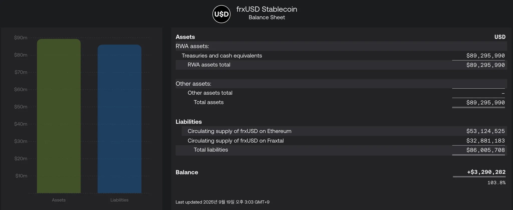 frxUSD 资产负债表显示,其资产完全由美国国债和现金等价物等现实世界资产组成。frxUSD 的总资产约为 8900 万美元,净资产约为 300 万美元,超额抵押率约为 104%。通过持有比总供应量更多的高质量抵押品并发布透明的储备数据,frxUSD 提供了稳定性和高水平的信任。