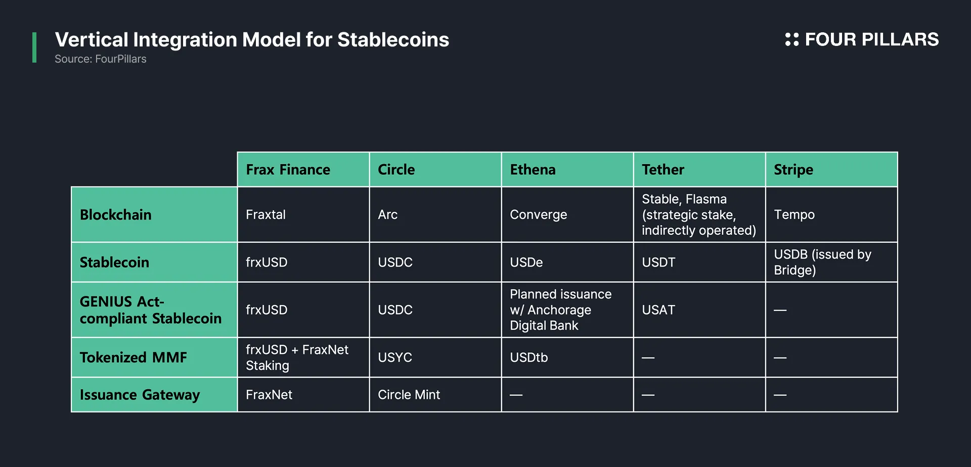 2024 年 2 月,Frax Finance 推出 Fraxtal,这是一个为 frxUSD 稳定币构建的区块链。与 Circle 和 Stripe 最近宣布构建自己的区块链相比,Frax Finance 在更早的阶段展示了垂直整合模式的方向。当 GENIUS 法案宣布时,Frax Finance 还迅速将 frxUSD 转换为符合 GENIUS 法案的稳定币,几乎与 Circle 的 USDC 同时,证明了其快速响应监管发展变化的能力。