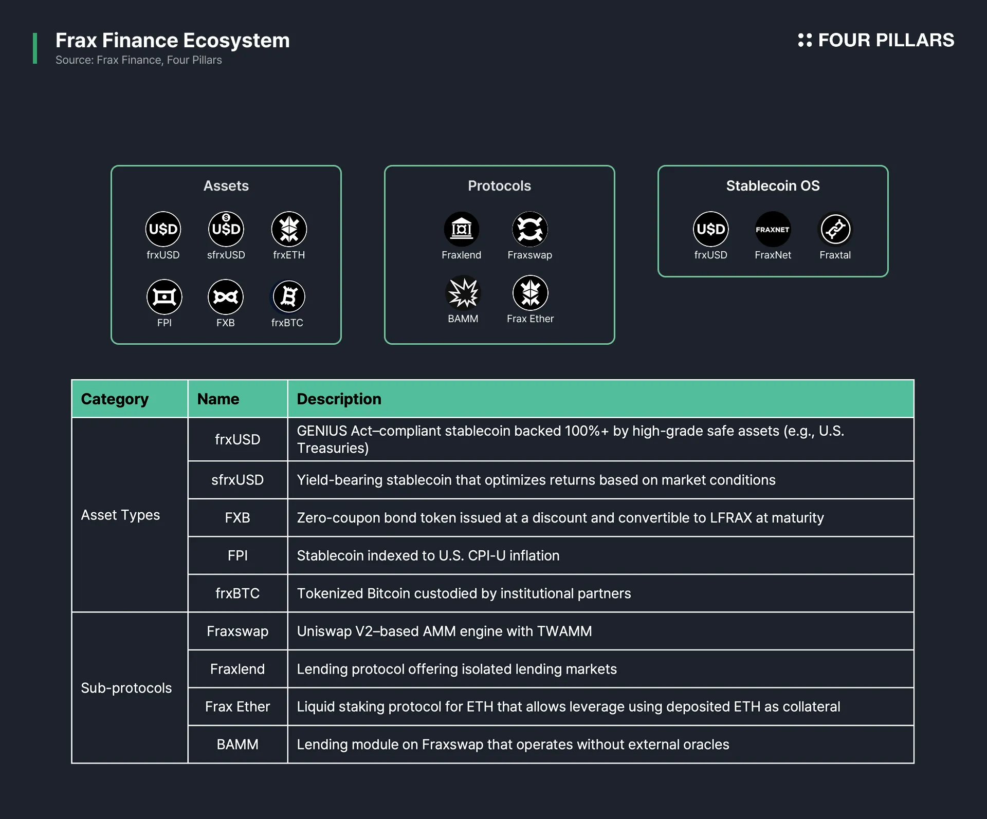 Frax Finance 将其稳定币操作系统 (OS) 的组件定义为三个核心支柱: