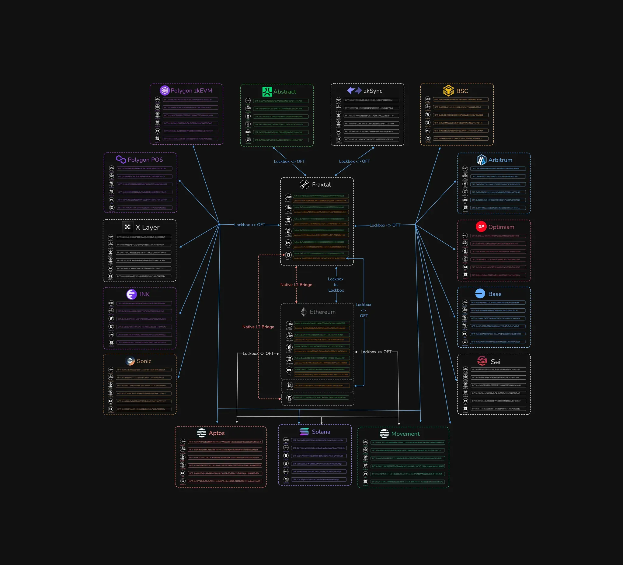 为了支持此策略,Frax Finance 使用 LayerZero Omnichain Fungible Token (OFT) 标准构建了专用的跨链解决方案。这使 Frax 子协议可以无缝地探索跨多个链的收益机会,并使 Frax 生态系统资产不仅可以连接到 Fraxtal,还可以连接到许多其他网络。