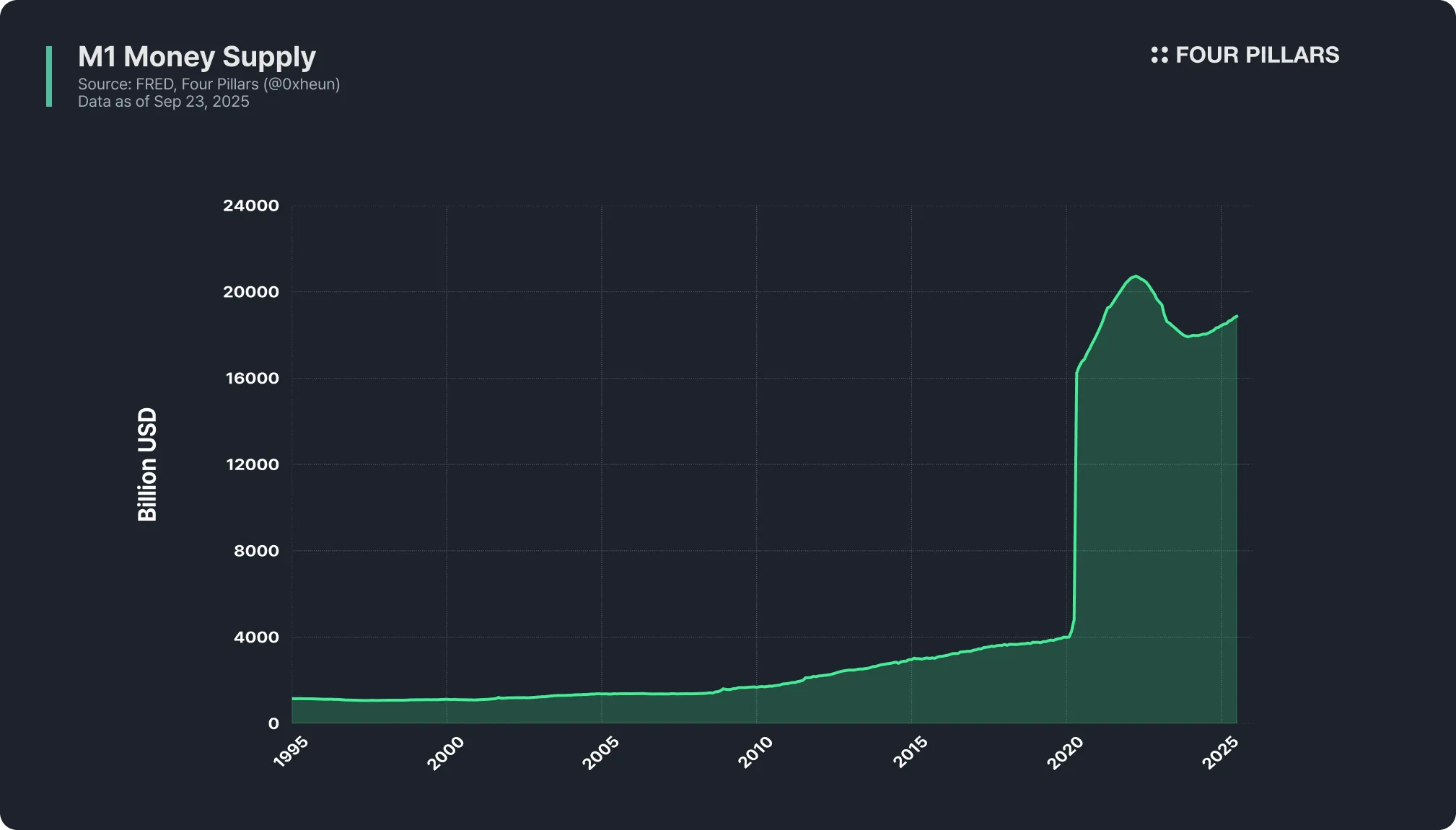 M1 代表了经济中可以立即支出的最具流动性的货币供应量。随着最近 GENIUS 法案的颁布,符合特定标准的稳定币已经获得了一个法律基础,可以被认为是与现金和活期存款同等的支付工具。