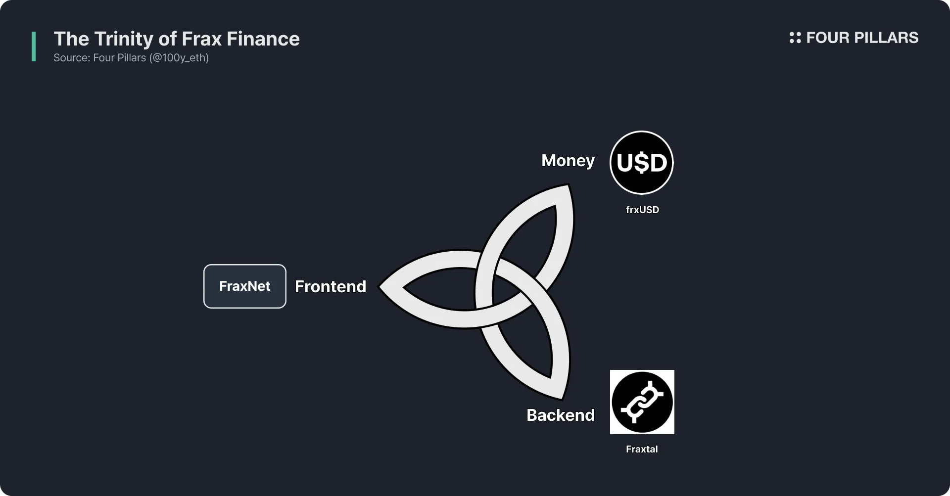 Frax Finance 将相同的框架应用于链上金融。在基于区块链的金融系统中,三个必不可少的组件是稳定币、前端和作为后端的区块链网络。Frax 通过 frxUSD、FraxNet 和 Fraxtal 实现这些组件,从而为其稳定币操作系统创建蓝图。以下各节将详细检查这三个组件。