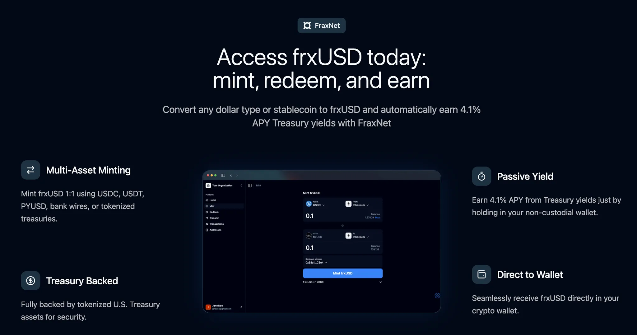 FraxNet: 一个平台,允许用户以非托管方式铸造和赎回 frxUSD,并从美国国债支持的储备金中获得稳定的收益,同时完全符合 GENIUS 法案。