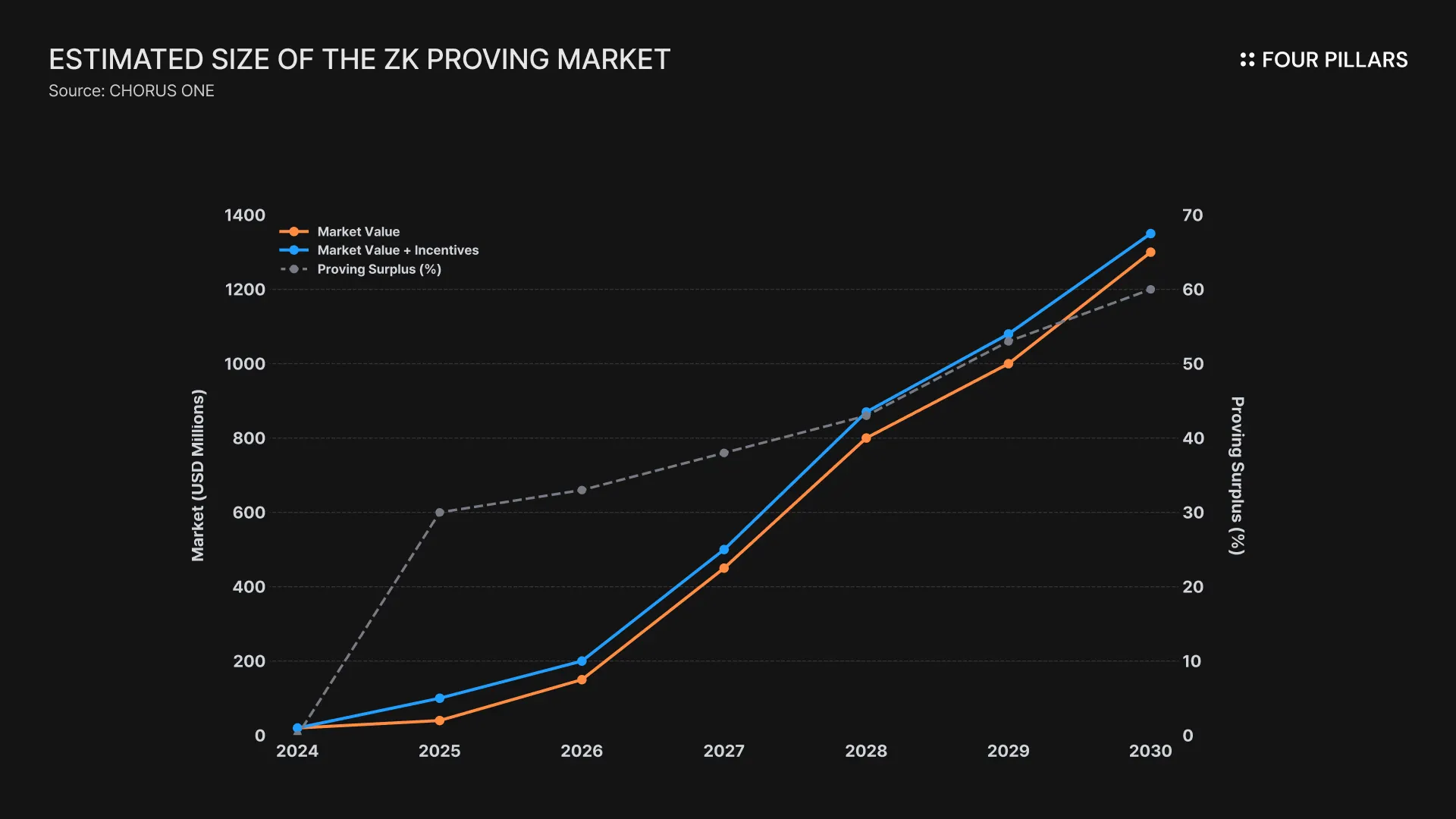 相比之下,ZK 证明市场预计将从 2025 年的约 9700 万美元增长到 2030 年的约 13.4 亿美元,复合年增长率为 68.6%。与今天的 PoS 验证奖励市场相比,这大约大 1.6 倍。这意味着一旦 ZK 证明和验证基础设施得到牢固建立,它可能会创造类似于或大于当前 PoS 验证基础设施的盈利机会,从而形成加密经济系统中的第三大支柱。