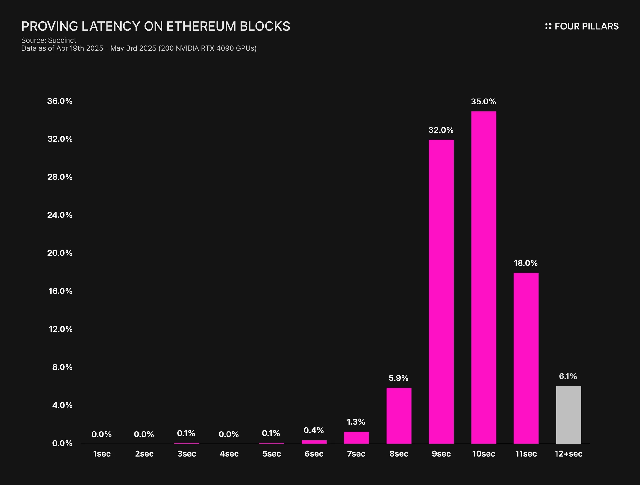 Succinct 的 SP1 Hypercube 是一种新模型,可增强 SP1 框架的内部性能。SP1 框架已被 Arbitrum 和 Mantle 等主要 rollup 正式采用。它在 12 秒内证明大约 93% 的以太坊区块,并接近 RTP 基准。通过与 Nethermind Security 的合作,它还完成了“形式验证”,从而获得了适用于金融级基础设施的可靠性级别。