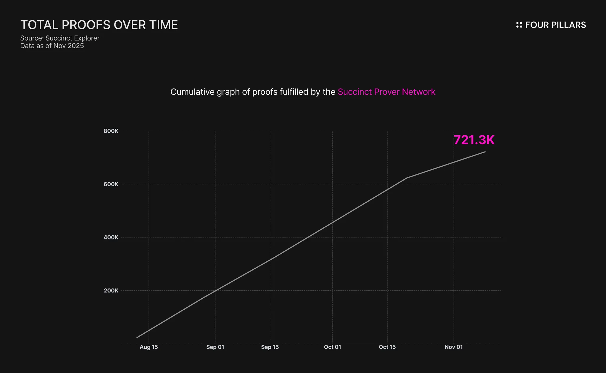 Succinct Prover 网络:该网络基于 SP1 基础设施,自 2025 年 8 月在主网上启动以来,发展迅速。通过“证明竞赛”机制,选择为每个任务提供最高效率价格和速度的证明者。截至 2025 年 11 月,它总共处理了超过 72 万个证明。