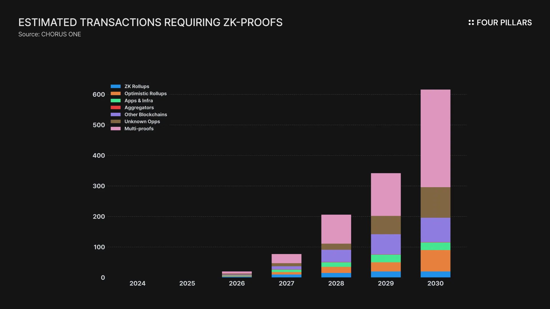 ZK 行业的增长潜力并非基于抽象的预期,而是基于真实且快速增长的需求。根据Chorus One的说法,2024 年大约发生了 5.9 亿次需要 ZKP 的交易,预计到 2030 年,这个数字将增长近 1000 倍,达到 6000 亿次以上。